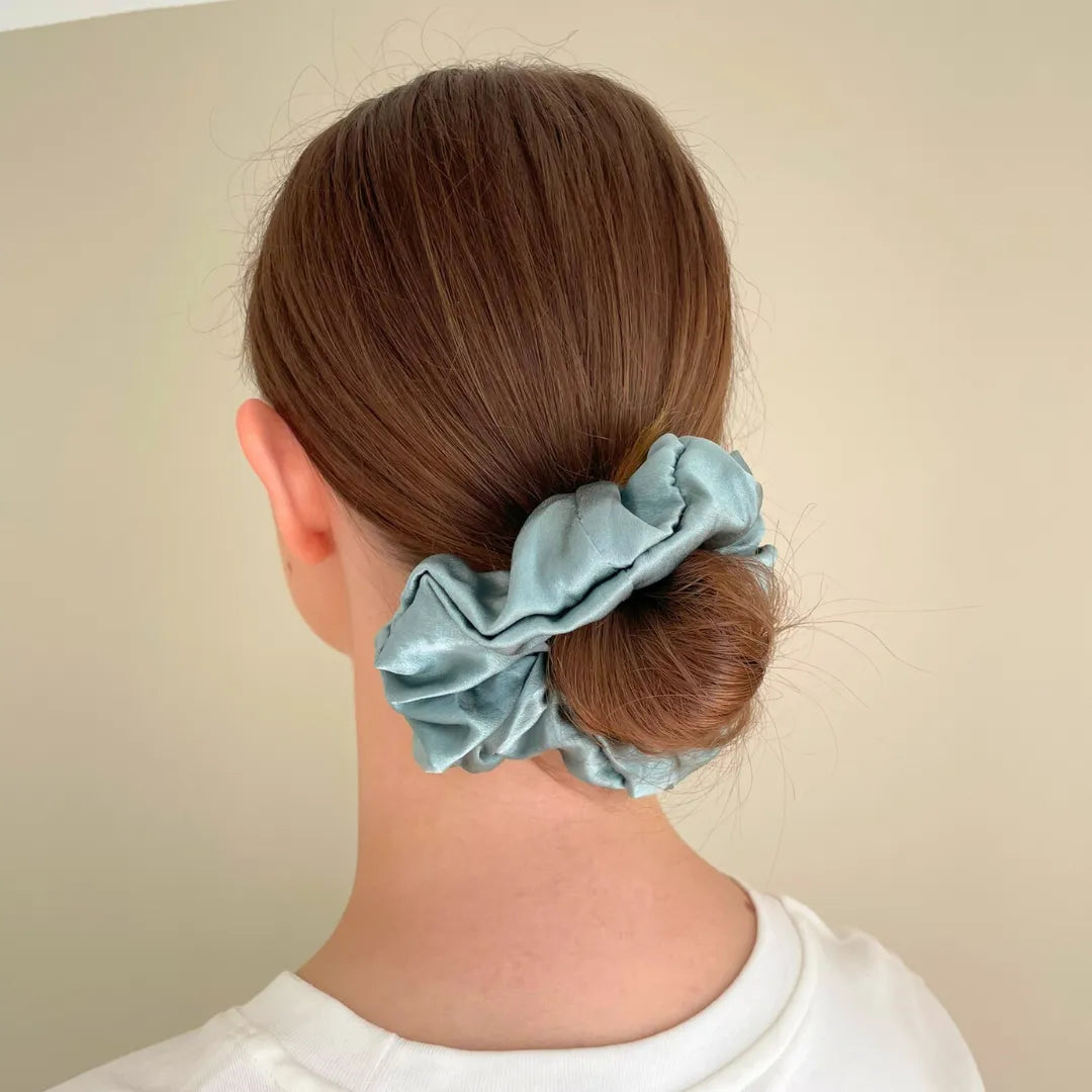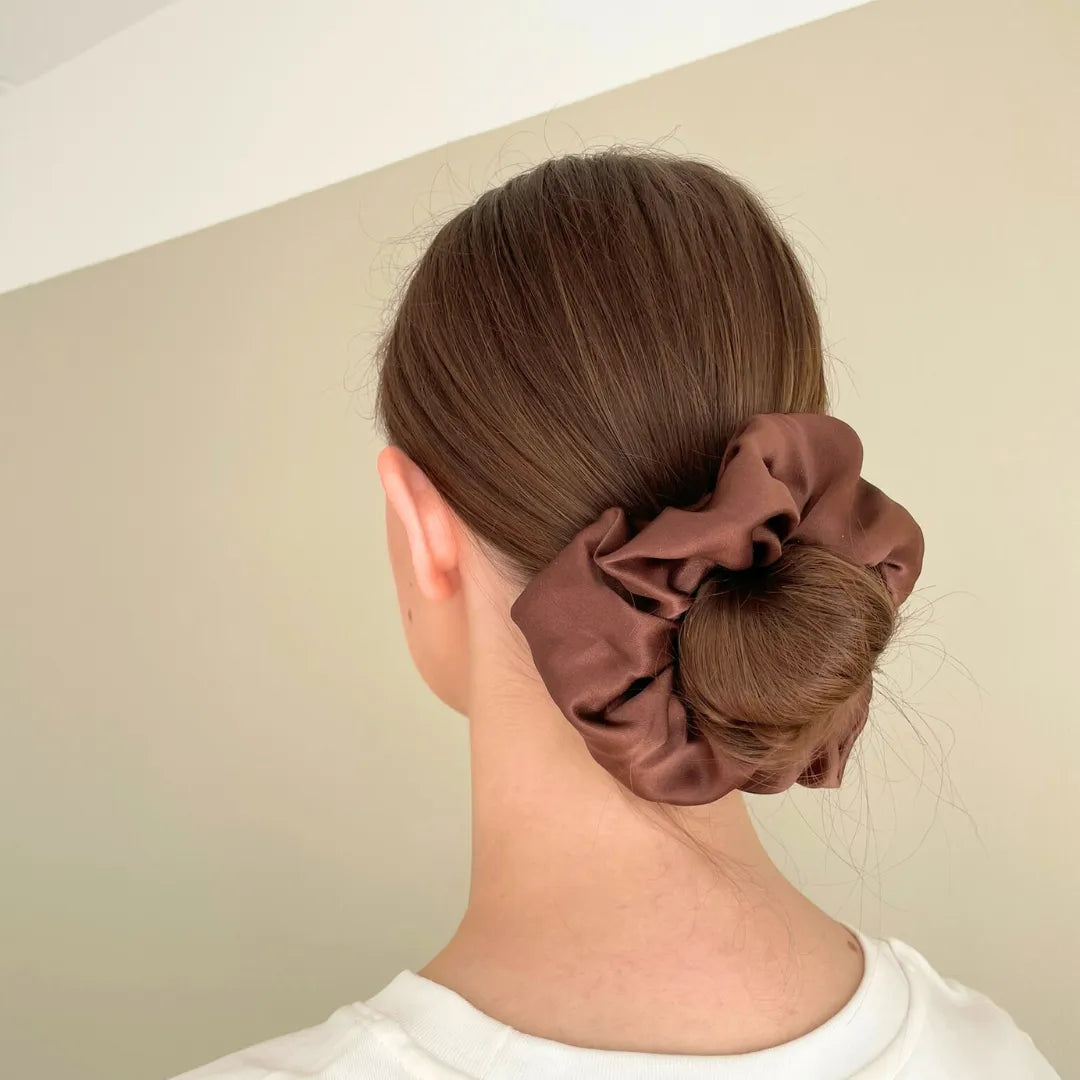 • Holder frisyren hele dagen: Den bløde elastik og silkens glatte overflade sørger for, at scrunchien holder godt uden at efterlade mærker eller skade håret.